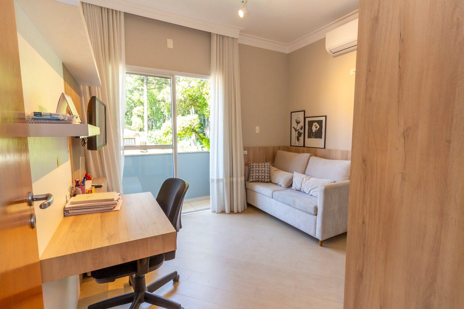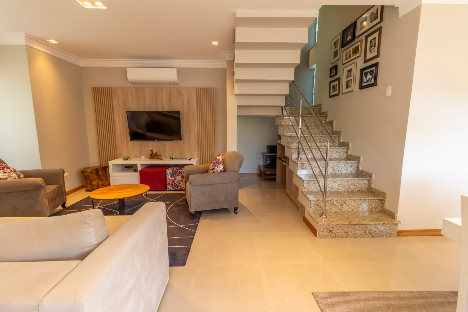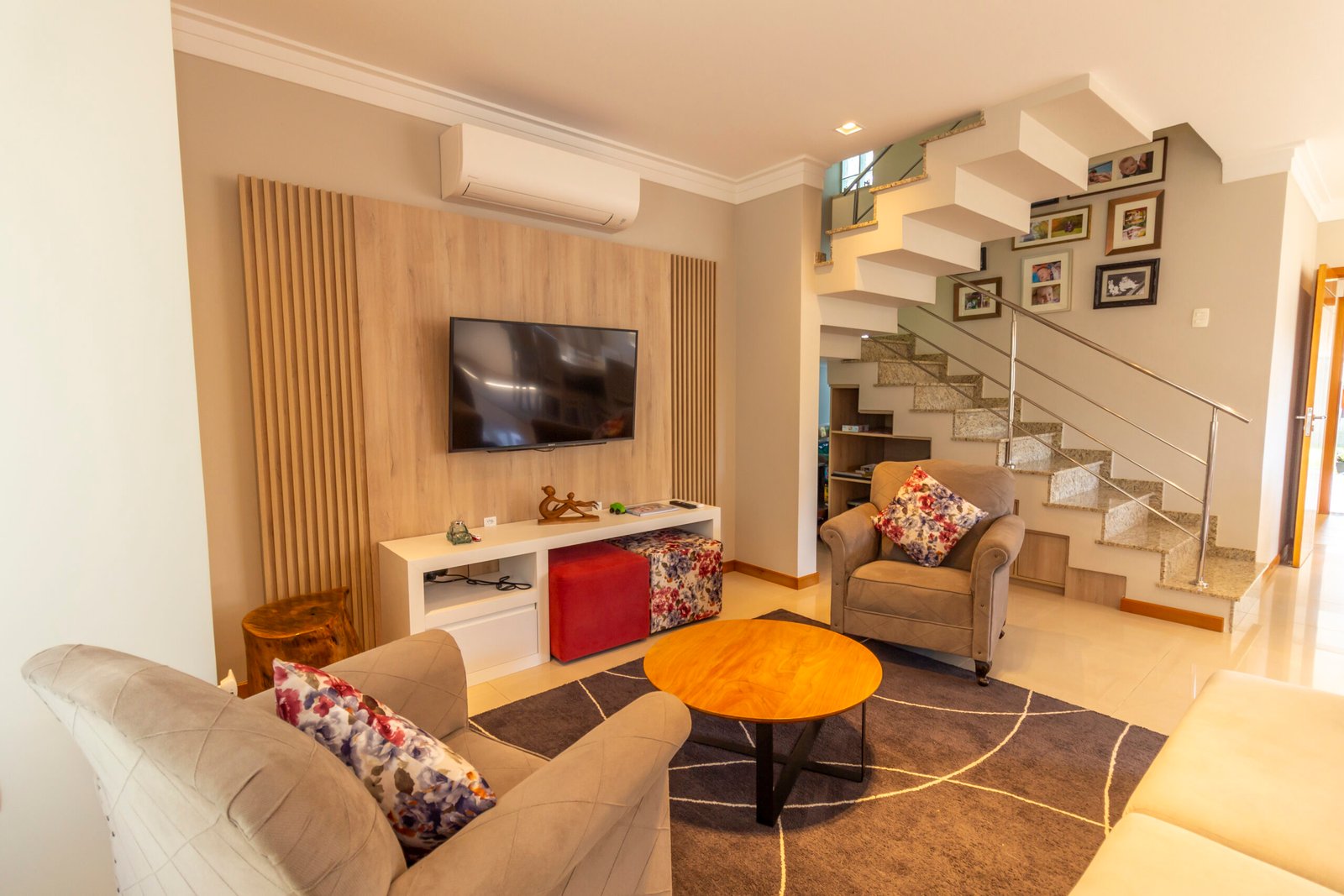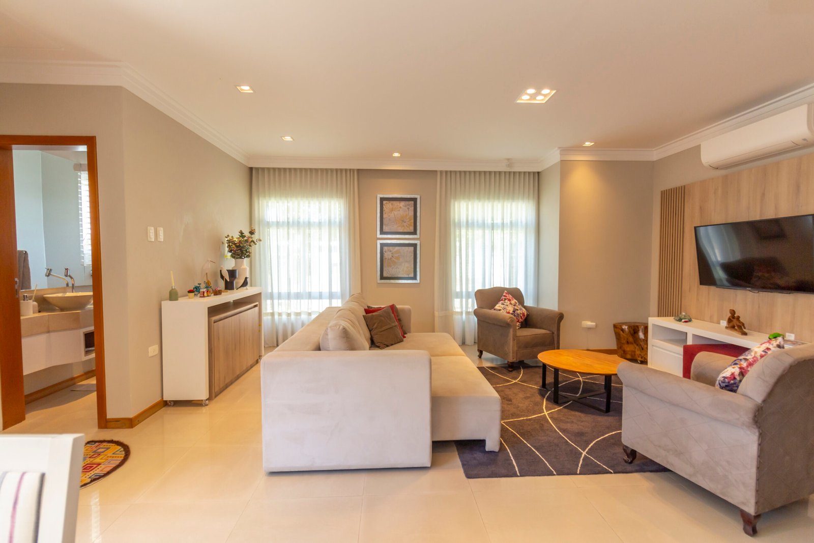 Sala de estar climatizada com painel de tv;
