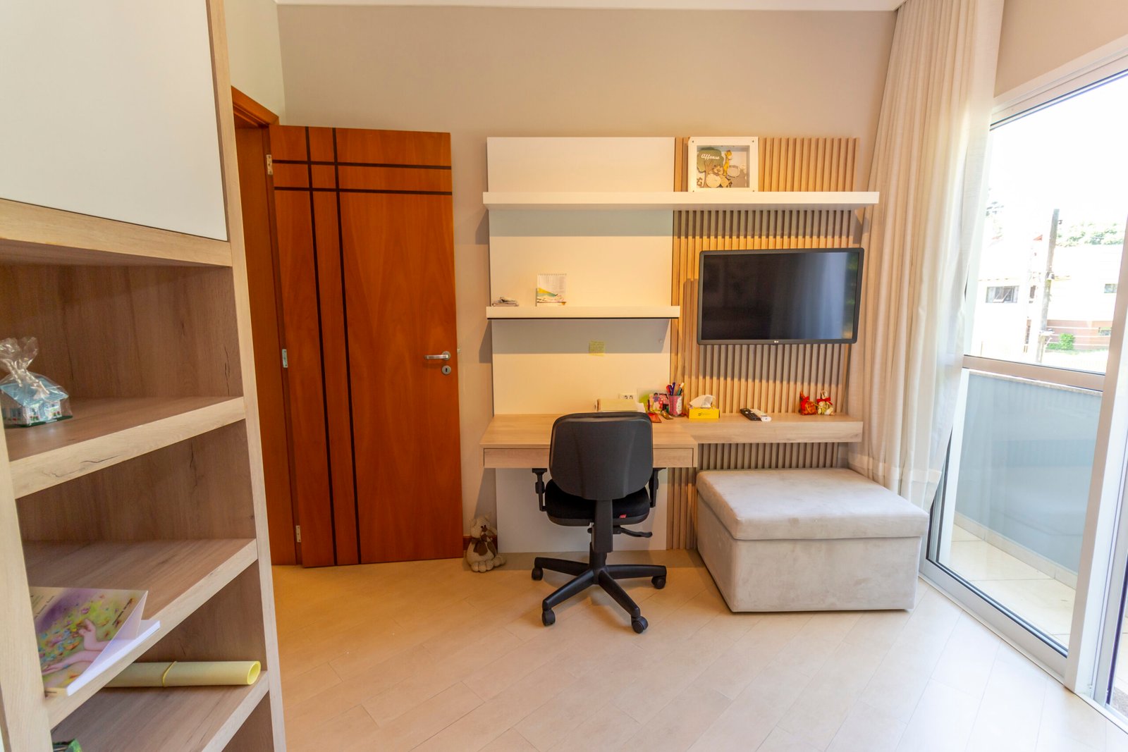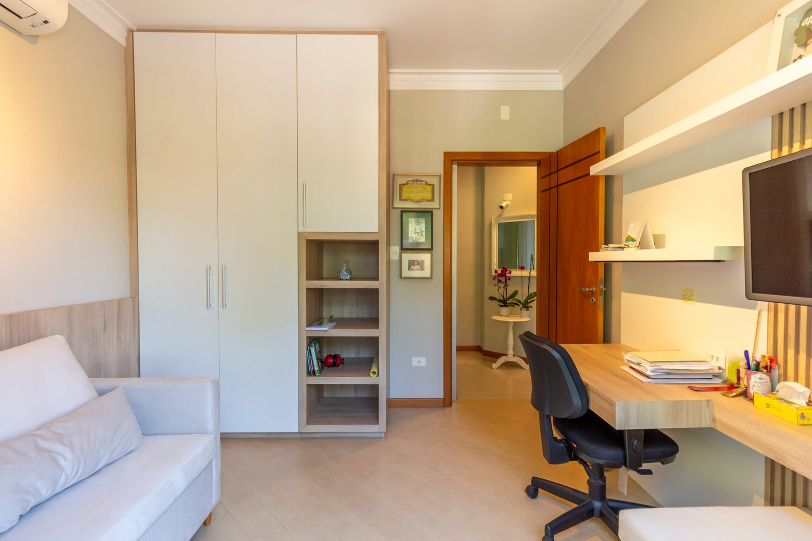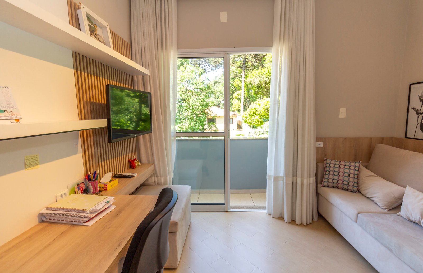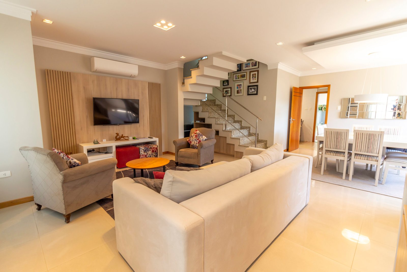 Sala de estar climatizada com painel de tv;