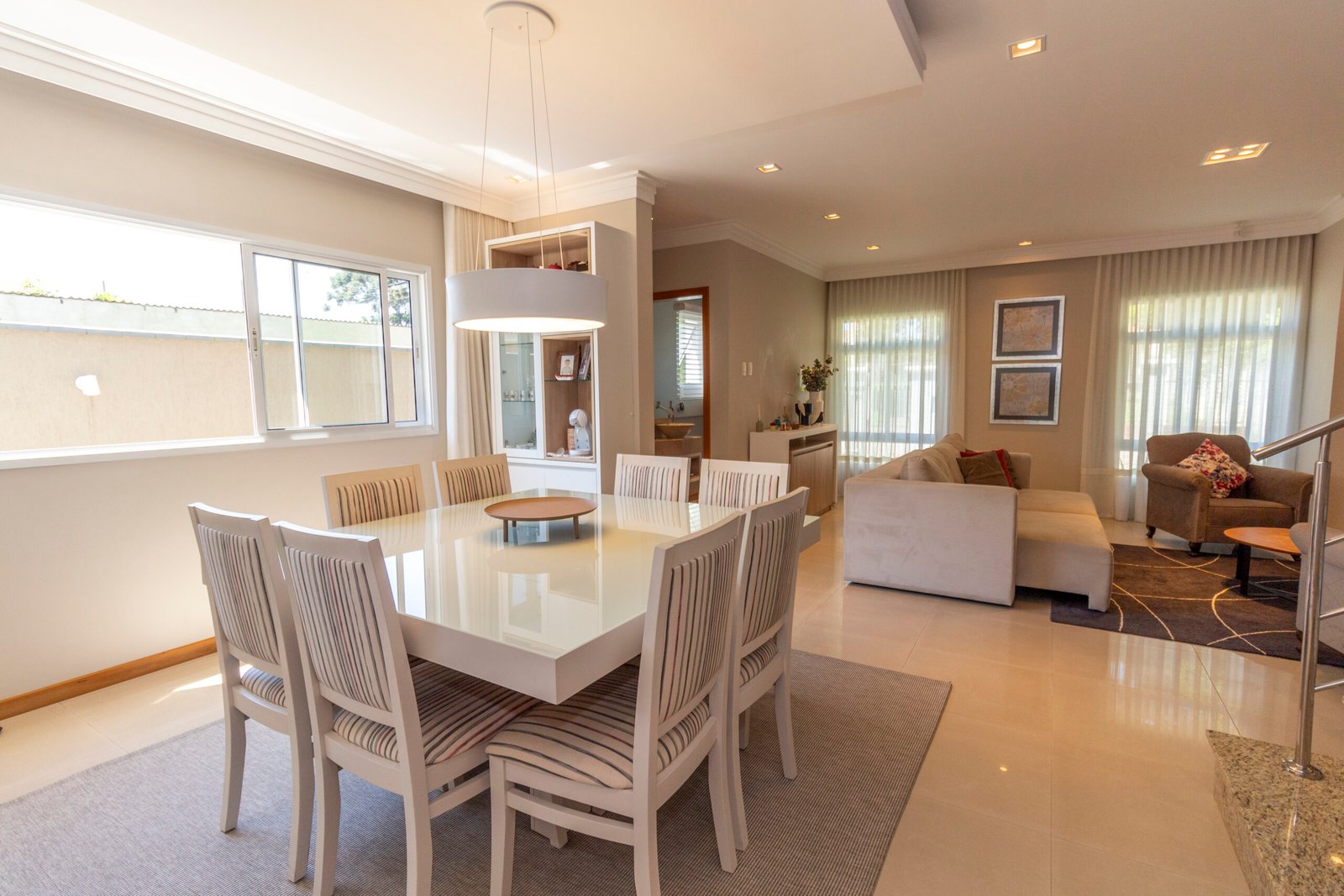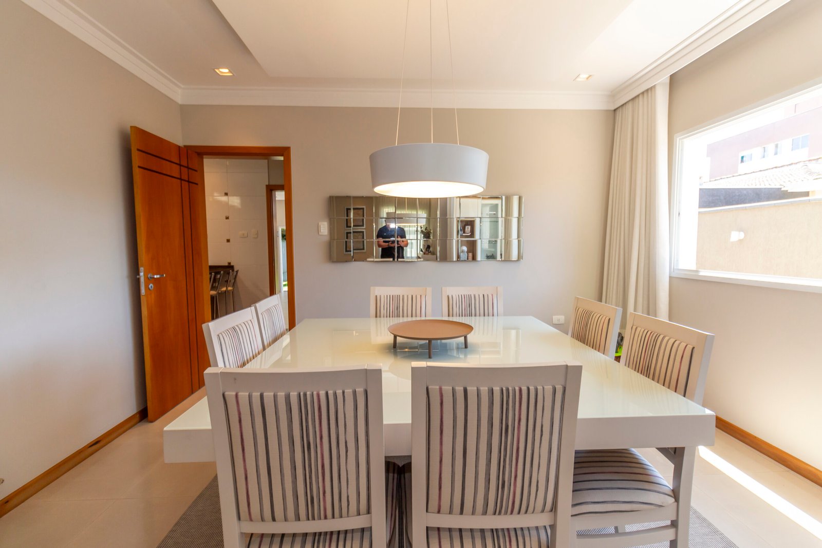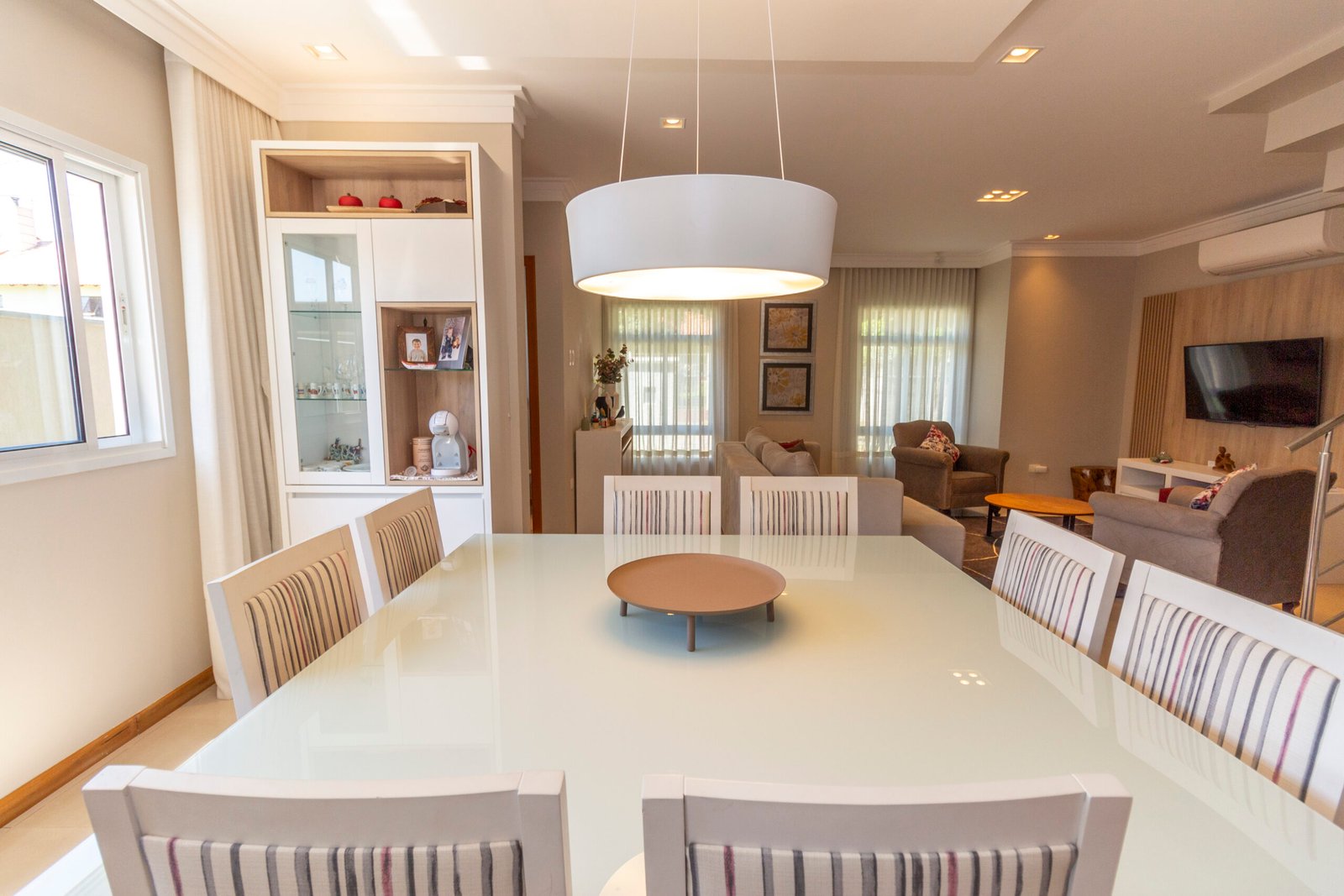 Sala de jantar integrada com cristaleira, espelho e mesa com 8 cadeiras;