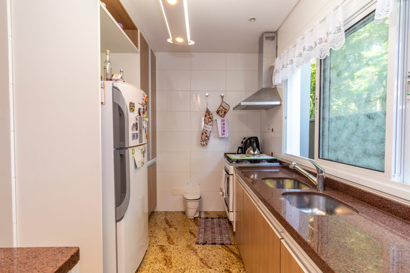 Cozinha separada com geladeira e passa prato;