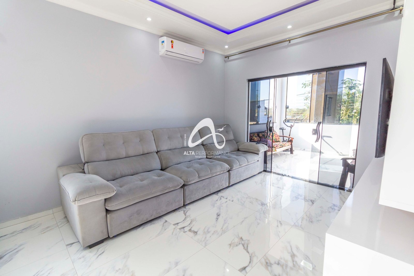 Sala de tv ampla com painel e ar-condicionado;