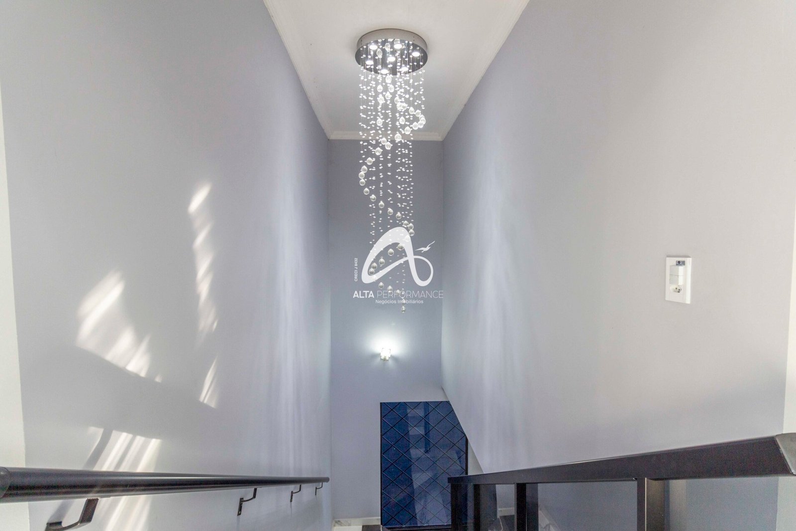 Escada larga com lustre de 2,5 metros.