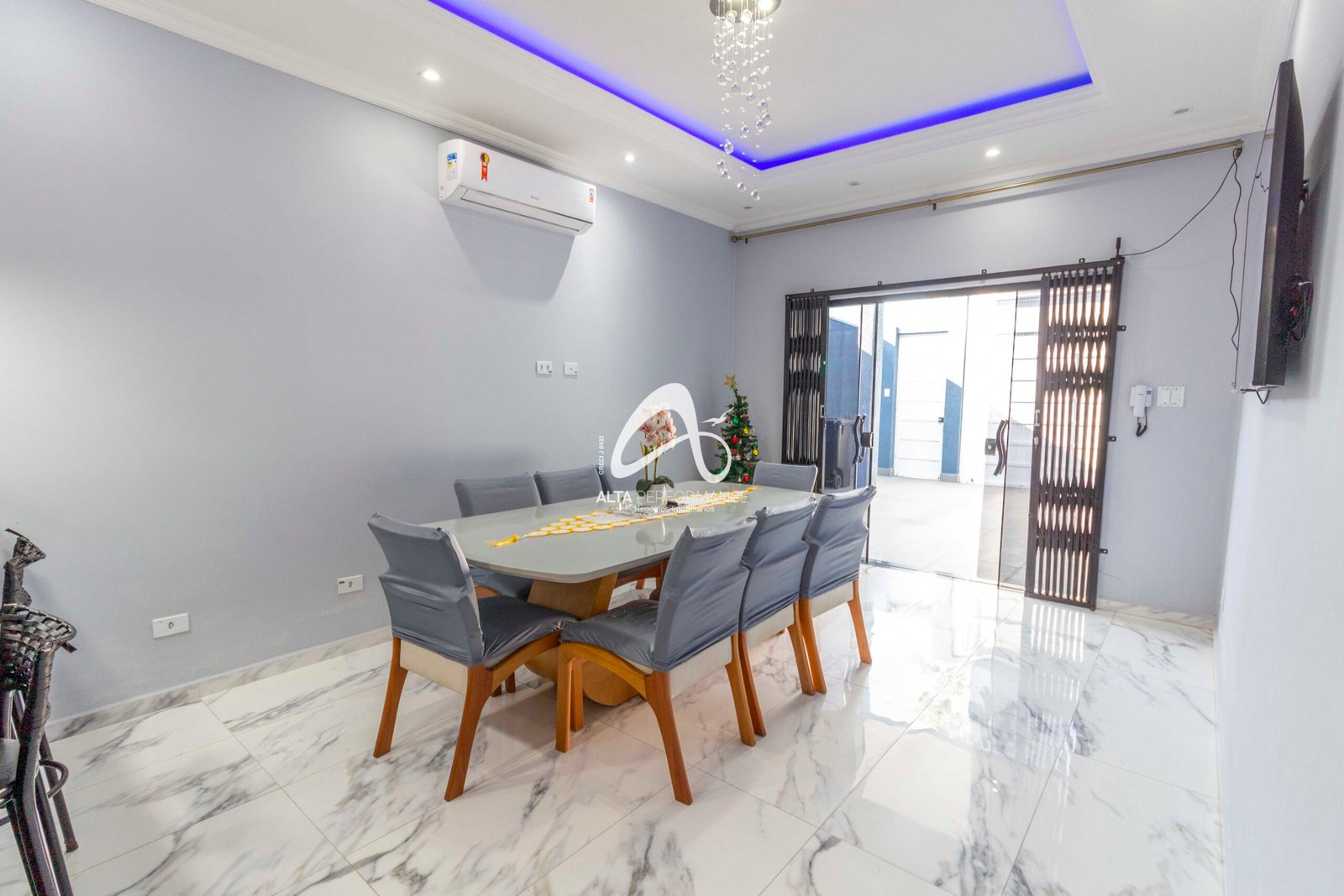 Sala de jantar com ar-condicionado, mesa e 8 cadeiras de madeira maciça;